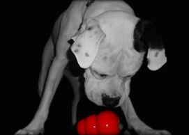 This super-bouncy, natural rubber compound is perfect for dogs that like to chew. We can stuff it with peanut butter or liver flavored treat.